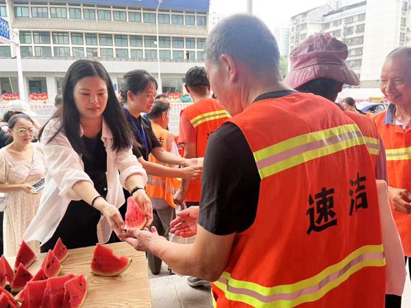 连日来,我市持续高温天气,在我市村(社区)党群服务中心、小区物业、商圈超市、暖心驿站等地的纳凉点,工作人员为户外工作人员和群众送去清凉。图一、居民们在东宝区龙泉街道金虾河社区纳凉点清凉度夏。图二、村民们在荆门高新区·掇刀区麻城镇板庙村纳凉点读书看报。图三、东宝区龙泉街道白云楼社区工作人员为户外工作人员送上西瓜。图四、在东宝区龙泉街道金虾河社区纳凉点,社区工作人员为纳凉居民沏上“爱心凉茶”。(记者 三毛 通讯员 李俊玲 黄锴璠 摄)