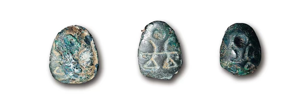 △从上往下分别是湖北黄冈禹王城出土的蚁鼻钱、铜圜(yuán)钱和铜箭镞。