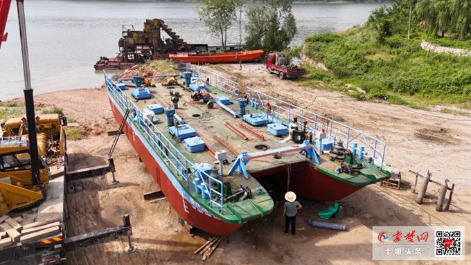 秦楚网-十堰头条讯 文、图/记者 冰客 通讯员 黄锋 王涛 报道:筹资500多万元,工作效率提高5倍以上。今年,郧阳区新打造两艘大型清漂船,其中一艘被誉为清漂“航母”的大船目前即将建造完工下水投用。届时,南水北调中线工程核心水源区汉江郧阳段江面上将有3艘清漂船守护汉江。