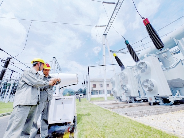7月23日,国网十堰供电公司运维人员采取放置冰块、启动喷淋设施和雾炮机等措施,为变电站主变压器“消暑降温”。入夏以来,十堰城区供电负荷持续攀升,该公司全力落实“运维跑在故障前”要求,持续开展电网设备检测,及时消除各类设备缺陷隐患,切实提升设备巡视、缺陷排查、运维保障等工作质效,全面提升电网供电可靠性。