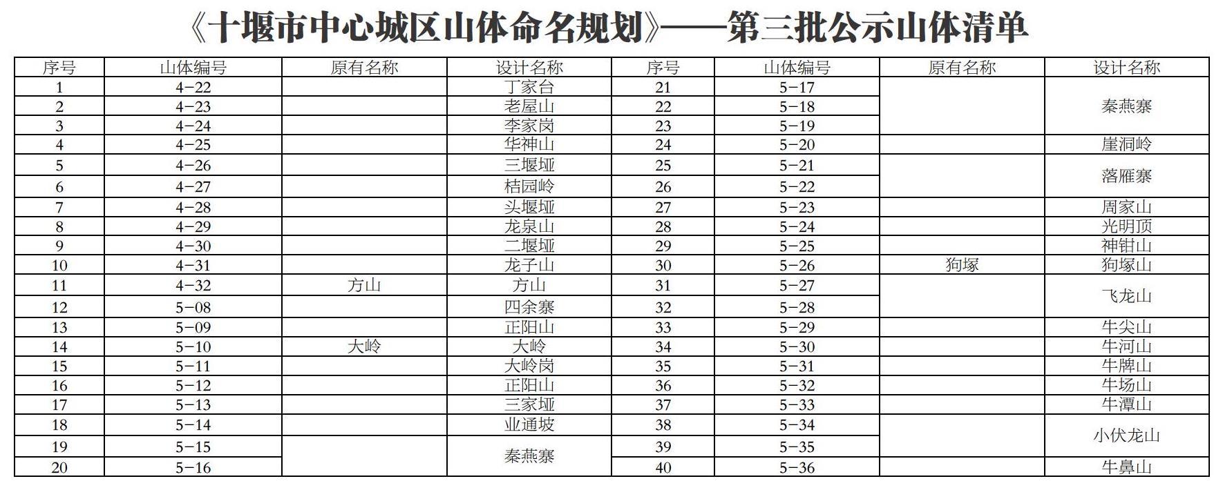 表1《十堰市中心城区山体命名规划》——第三批公示山体清单(见后表)