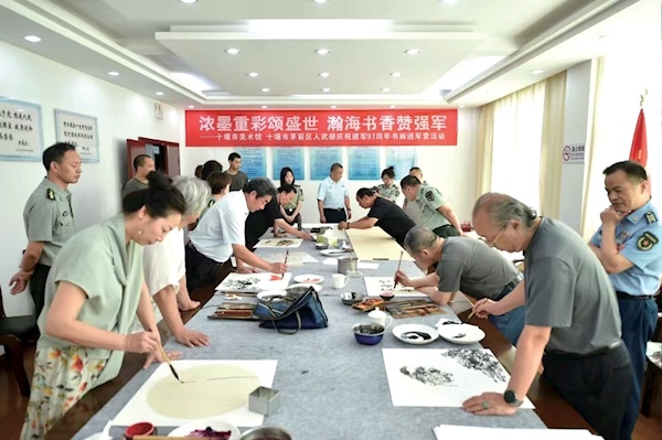 “八一”建军节即将来临,市美术馆举行“红色文艺轻骑兵”书画进军营活动,艺术家们来到茅箭区人武部,现场挥毫泼墨,将一幅幅寓意着军民团结、家国情怀的书画作品赠予官兵,生动诠释了“军爱民、民拥军,军民团结一家亲”的深厚情谊。图/记者 冰客 通讯员 毕涛
