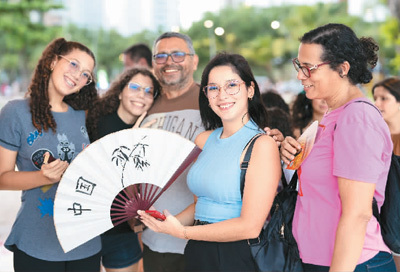 今年2月,在巴西累西腓,一名女子在中国春节庆祝活动上展示自己书写的扇面。 新华社记者 王天聪摄