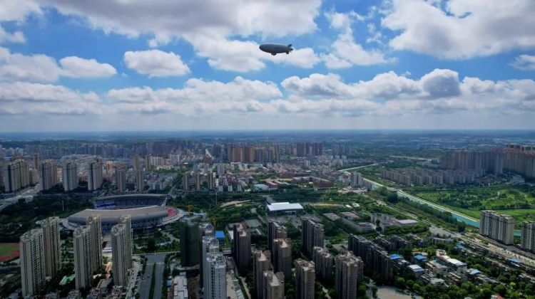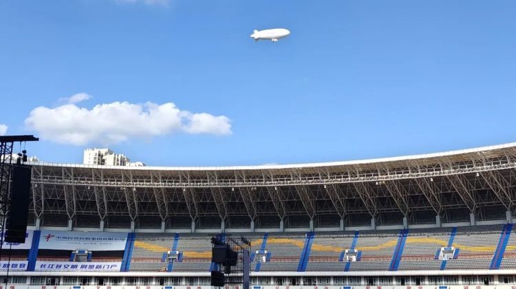 8月3日16时27分,由航空工业特飞所自主研制的“祥云”AS700载人飞艇飞行至荆门生态运动公园体育场,开展城市安保任务场景演示飞行活动。