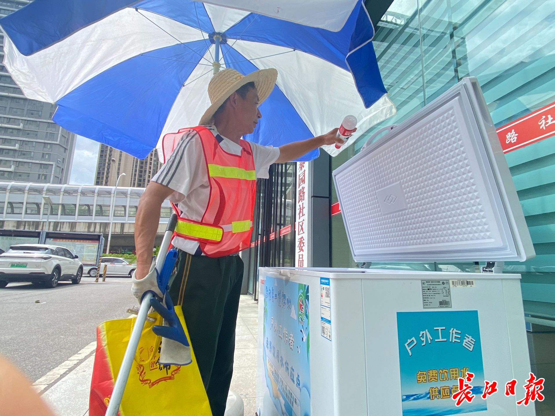 长江日报大武汉客户端8月4日讯“刚工作完,一口冰水下肚,太舒爽了!”8月2日中午,刚打扫完路面的环卫工人万清华,直奔武昌区徐家棚街道秦园路社区新时代文明实践站,熟练地从门口冰柜中拿出一瓶冰镇矿泉水,一饮而尽。