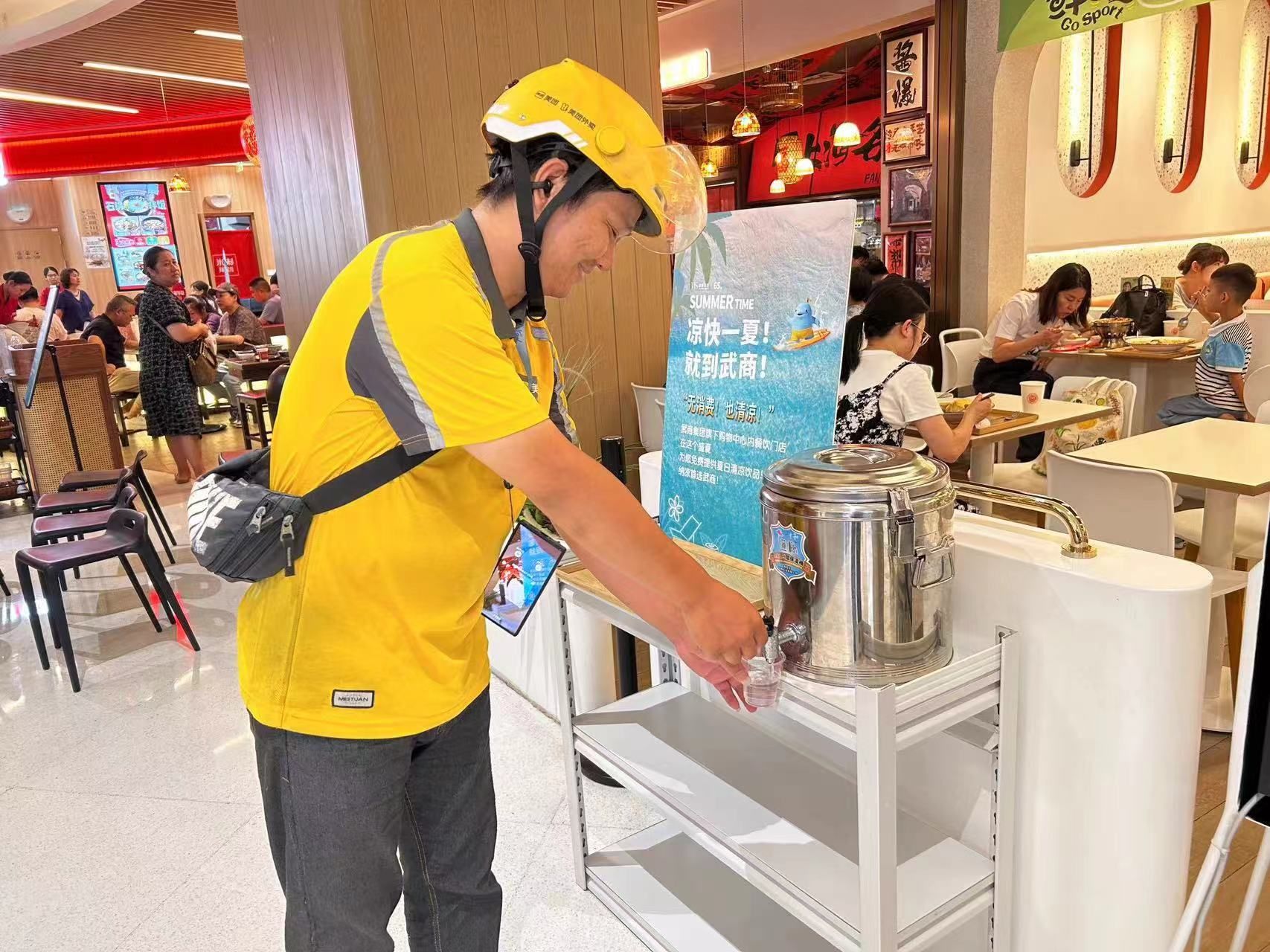 在中商世界里(销品茂),不少门店设有“致敬每一滴汗水,请骑手喝冰饮”的温馨提示语。“看到他们这么辛苦,我们只是想尽一份绵薄之力,让他们感受到社会的温暖。”付先生在成都(中商里店)肖经理说,每次碰到外卖小哥火急火燎地赶来取餐,服务员都会特意提醒他们“来杯酸梅汤,消消暑”。