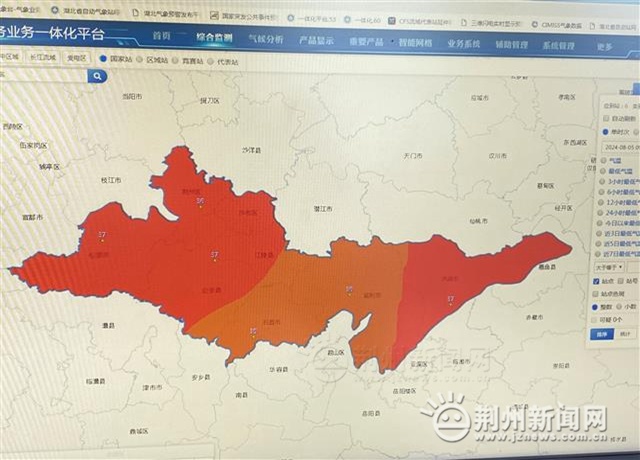 7月1日至8月4日,荆州市6个国家气象站监测平均气温平均值为30.4℃,较历史同期偏高1.6℃,最高气温平均值为34.2℃,较历史同期偏高1.6℃。各站高温日数大于35℃,8—18天,除监利基本持平外,其余各站较常年偏多3-7天。各站高温日数大于37℃,3—7天,较常年偏多1—5天。