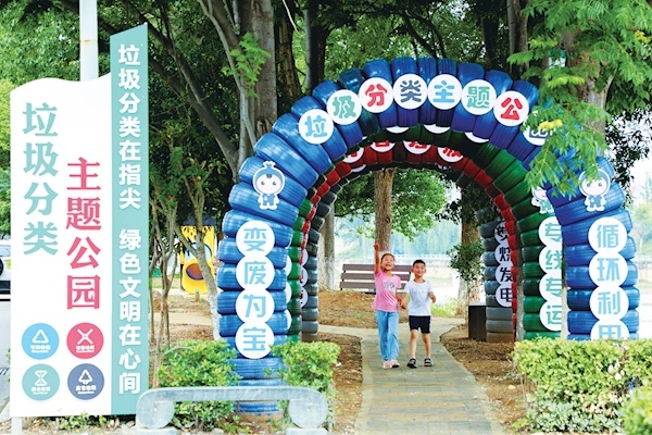 7月31日,市民在房县新开放的垃圾分类主题公园内游玩。该公园位于房县晓阳路与滨河大道交会处,在保留原有绿地景观的基础上进行了改造升级,植入绿色环保、科学分类、循环利用的理念,增设创意景观小品和科普宣传展板,设置有宣教中心、形象展示区、知识科普区、互动游戏区和沉浸式体验步道,让市民在休闲娱乐的同时了解垃圾分类知识,养成垃圾分类好习惯。