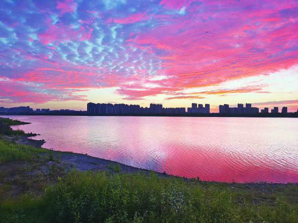 8月5日清晨,在漳河新区凤凰湖湿地公园,霞光倒映,水天共色,远近如诗如画,美不胜收。(记者 蒋子龙 摄)