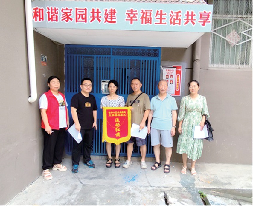 “这个单元公示栏没有定期清理,扣2分。”“2单元楼栋灯不亮了。”评选小组由怡和小区党支部、业委会、楼栋长、单元长及居民代表组成,通过现场查看,对照“文明楼栋”评分标准,从环境卫生好、文明风尚好、邻里关系好等方面对每个楼栋单元进行综合考评打分。最终,25号楼3单元获得小区“文明楼栋”称号,被授予流动红旗,怡和小区党支部在小区微信群对该单元居民进行表扬。