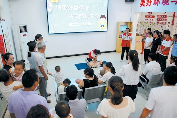 8月1日,在郧阳区杨溪铺镇青龙泉社区,志愿者向社区居民演示溺水患者心肺复苏急救法。当日,郧阳区红十字会与区妇联在青龙泉社区联合开展安全宣讲活动,宣传防溺水知识,提高居民自护自救能力。特约记者曹忠宏摄