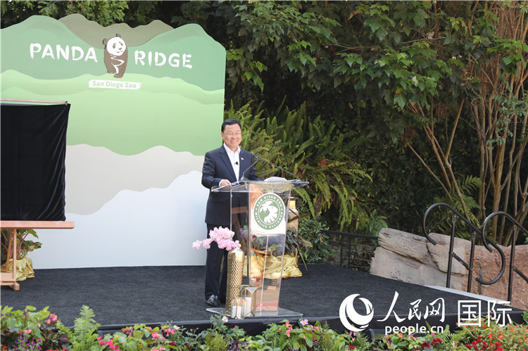 当地时间8月8日,美国加利福尼亚州圣迭戈动物园举行大熊猫新馆开馆仪式。中国驻美大使谢锋发表致辞。人民网记者 李志伟摄