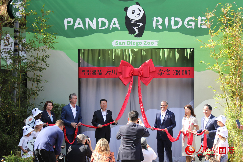 中国驻美国大使谢锋、加州州长纽森、圣迭戈市市长格洛利亚等人共同为“熊猫岭”开馆剪彩。人民网记者 李志伟摄
