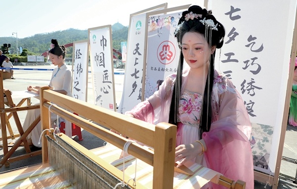 2023年,郧西织女绣被列入第八批市级非物质文化遗产代表性项目名录,其主要艺术特点是图案工整娟秀、色彩清新高雅、针法丰富、雅艳相宜、绣工精巧。本次展出的作品是专家评审从57件参赛作品中,评选出的9件优秀织女绣作品,其中张春梅的作品《七夕刺绣挎包》获得一等奖,邹龙霞的《湖北解放第一县》和梅艳的《七夕刺绣鞋垫》获得二等奖,夏照平的《绣花兜肚》、张楚香的《七夕刺绣手帕》和邱敬晓的《党旗飘扬》获得三等奖。(左图为“织女”展示传统织布技艺)