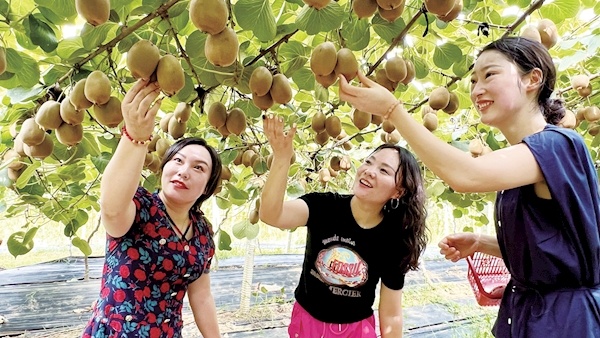 ①8月10日,在郧阳区青曲镇安沟村猕猴桃基地,游客在采摘猕猴桃。青曲镇探索“两山”转化路径,建成“四季有果”特色小镇,带动群众增收致富。通讯员 姬廷顺摄