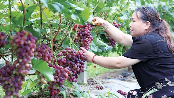 ③8月14日,在房县军店镇中村村葡萄园,游客在采摘葡萄。军店镇土壤透气性好、光照充足,种植的葡萄汁水饱满、酸甜适宜,深受消费者青睐。记者全正摄