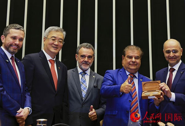 中国驻巴西大使祝青桥在巴西国会庆祝中巴建交50周年特别会议上发表致辞。人民网记者 宋亦然摄