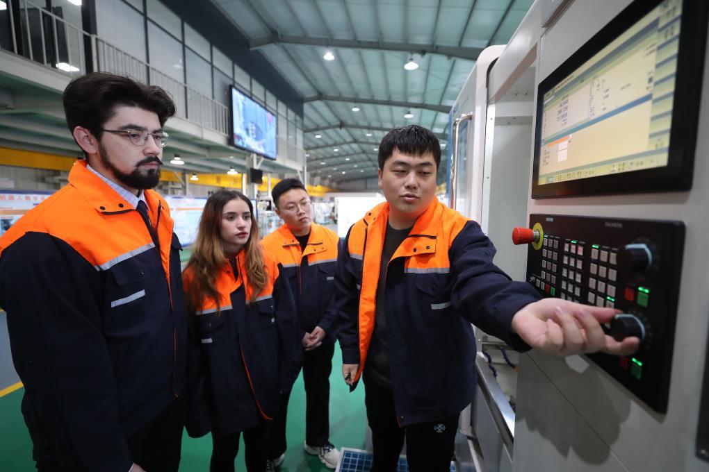 2023年12月6日,沈工-华中数控“一带一路”订单班同学为俄罗斯伊尔库茨克国立大学的留学生讲解数控五轴加工中心操作经验。新华社记者杨青摄