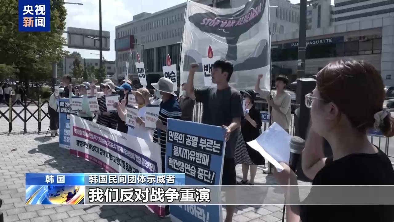 19日上午,多个韩国民间团体在首尔龙山总统府前举行抗议集会,要求立即停止韩美军队当天启动的联合军事演习。