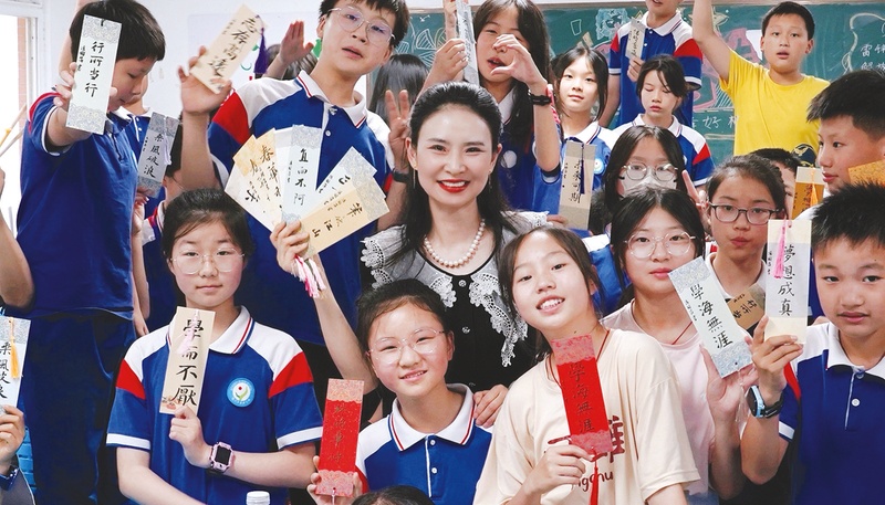 冯雅萍一边亲手赠送书签,一边语重心长地说道:“同学们,老师今天送给你们这些书签,是想要给你们上最后一课,这一课叫作‘终身学习’。”接着她讲述了学习摄影、古筝和书法的心路历程。