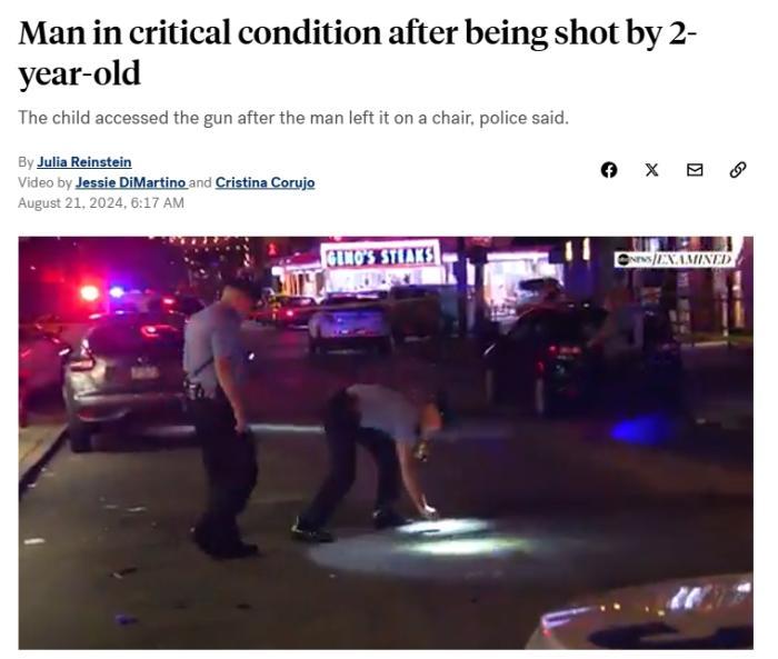 中新网8月21日电 综合美媒报道,美国警方称,日前,弗吉尼亚州一名男子被2岁儿童意外开枪击中,目前处于危急状态。