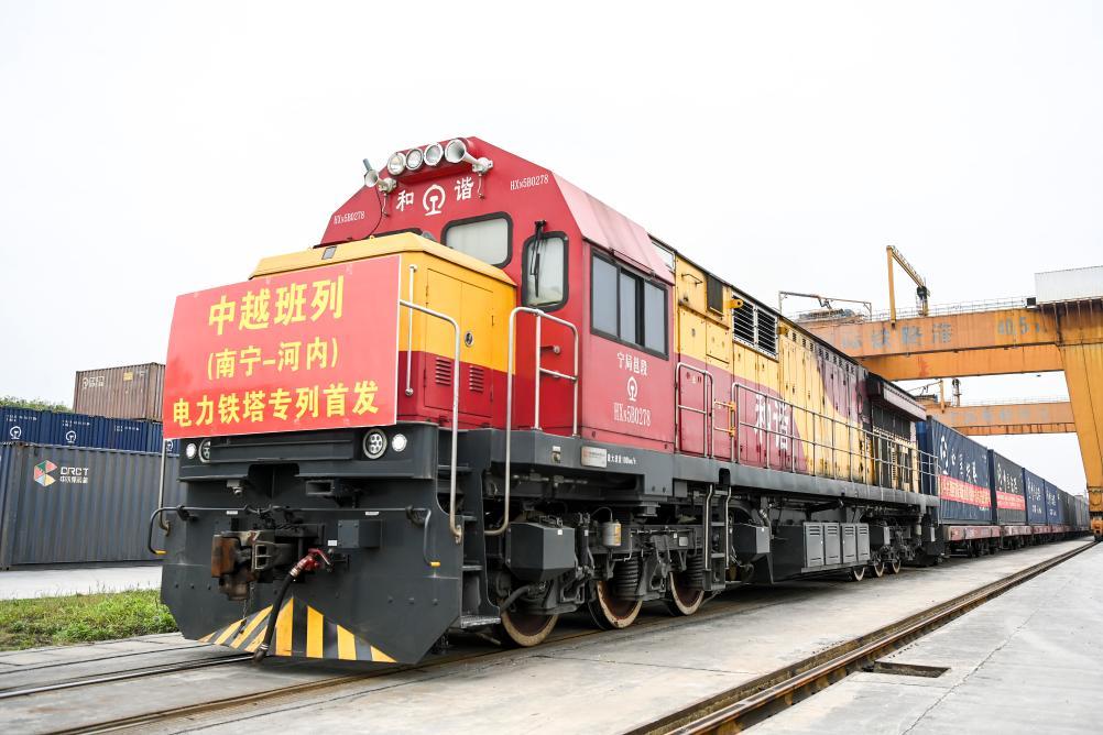 3月8日,在南宁国际铁路港,电力铁塔专列准备发车。3月8日上午,一列满载340吨电力铁塔的中越班列从广西南宁国际铁路港开出,发往越南河内。这是广西首次开行电力铁塔专列。新华社记者曹祎铭 摄