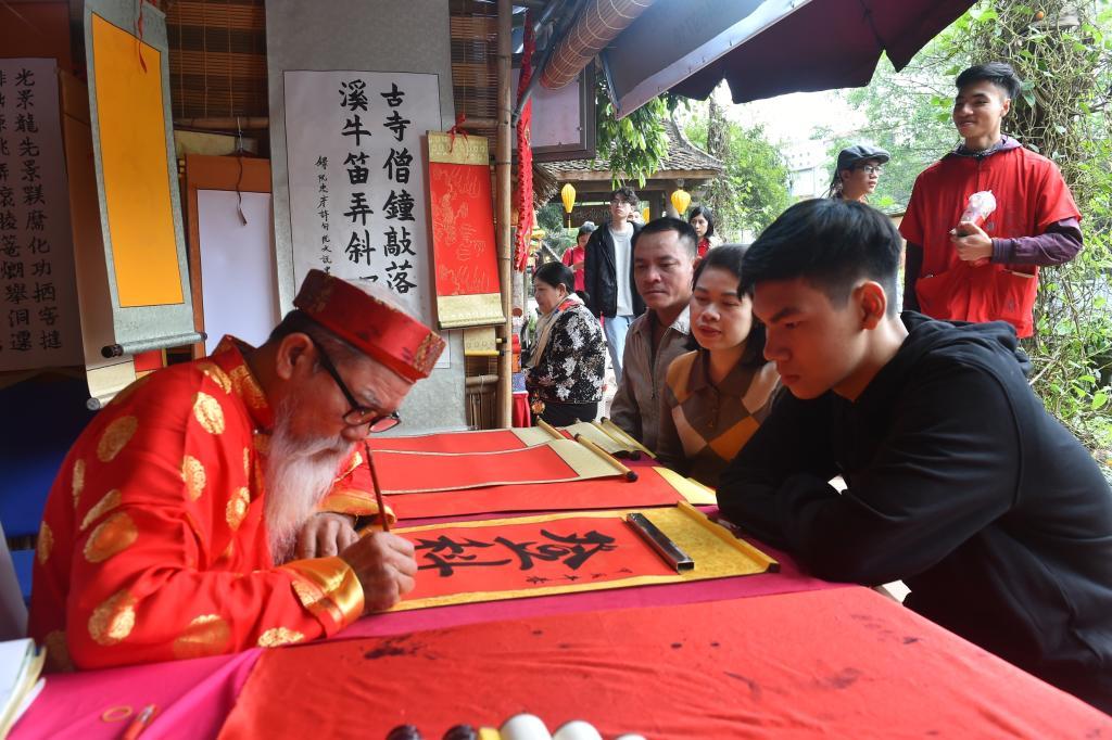 2月10日,在越南河内的文庙-国子监,一名越南书法家为前来求字的一家三口书写汉字“登科”。2月3日至2月19日,一年一度的新春书法节在越南首都河内的文庙-国子监举办。本次活动以“好学”为主题,邀请数十名越南书法家参与,其汉字书法作品集中展示区成为越南民众的新晋打卡地。每逢农历春节,许多越南民众求取汉字书法作品为新年讨个好彩头。新华社记者胡佳丽 摄