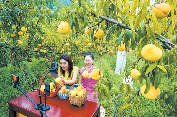 8月20日,在郧阳区杨溪铺镇罗沟村黄桃种植基地,网络达人通过直播推介黄桃。为促进黄桃销售,郧阳区电商平台积极与黄桃种植户对接,组织网络达人到果园开展直播,向消费者直观呈现黄桃种植及收获情况,拓宽黄桃销售渠道,帮助果农增收致富。特约记者周家山摄