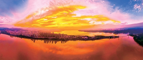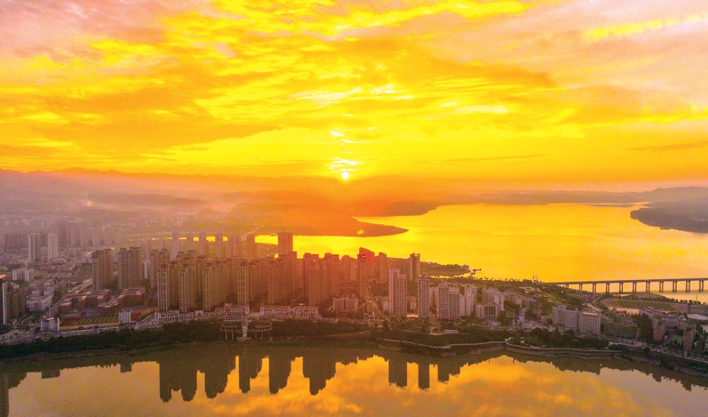 近日早晨,降雨过后的南水北调中线工程核心水源区,郧阳区迎来一片朝霞,水天一色的红、半岛的城区、山峦叠嶂的群山在朝霞中显得更加美丽。图/记者 冰客 特约记者 周家山