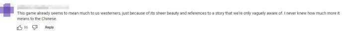 还有人感叹,“仅凭借纯粹的美感和一些我们不太了解的故事背景,这款游戏就已经让我们西方人觉得很有意义了。我之前并不知道,它对中国人意味着更多。”