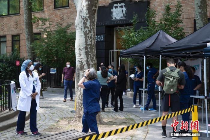 资料图:当地时间6月24日,美国纽约市政府在曼哈顿开设临时诊所,为易感人群接种猴痘疫苗。中新社记者 廖攀 摄