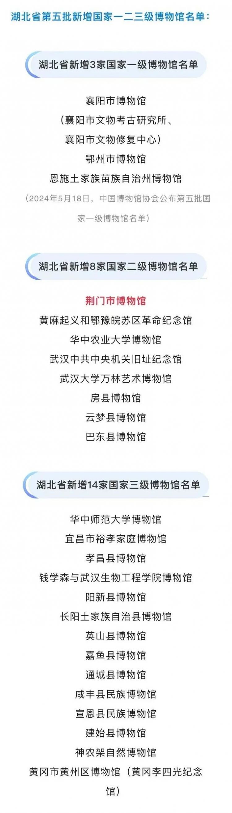 8月23日上午,第十届中国博物馆及相关产品与技术博览会在呼和浩特市敕勒川国际会展中心盛大开幕,会上正式揭晓了第五批国家二、三级博物馆名单,湖北22家博物馆上榜,其中8家博物馆获评二级、14家博物馆获评三级,荆门市博物馆荣升“国家二级博物馆”。