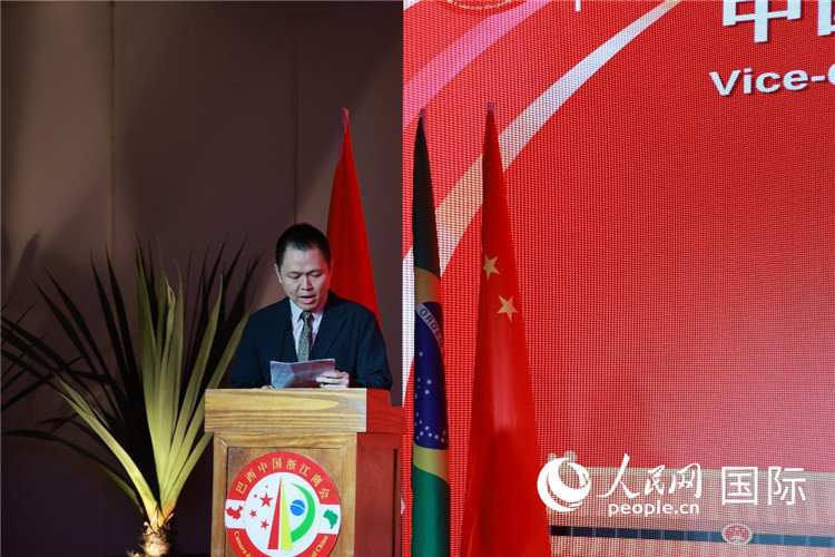 巴西中国浙江商会执行会长陈翔广宣读贺电。人民网记者 陈海琪摄