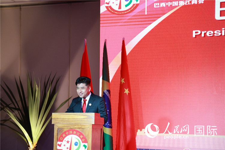 巴西中国浙江商会会长郑侠茂发表就职演讲。人民网记者 陈海琪摄