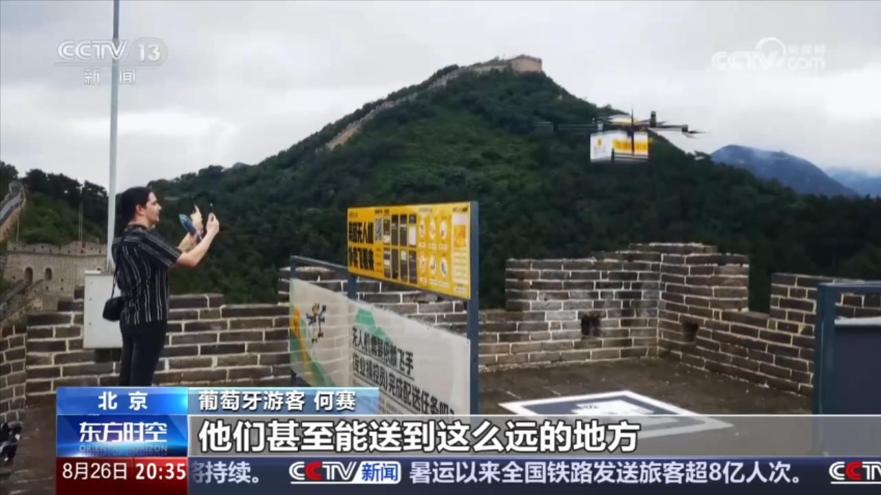 北京八达岭长城近期开通了无人机送外卖服务,最快五分钟,来自山下的酸梅汤、雪糕、创可贴等商品就能送到长城上来。记者来到长城这天,小雨淅淅沥沥。在南九城楼的一处无人机送餐点,一位外国游客正在和中国朋友尝试用外卖送一把雨伞。