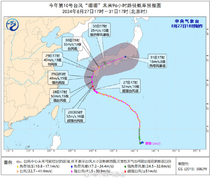 受其影响,27日夜间至30日,东海东部海域将有8~10级大风、阵风11~12级,部分海域风力可达11~13级、阵风14~15级,“珊珊”中心经过的附近海域风力可达14~15级、阵风16~17级。建议相关海域船舶需注意航行安全。