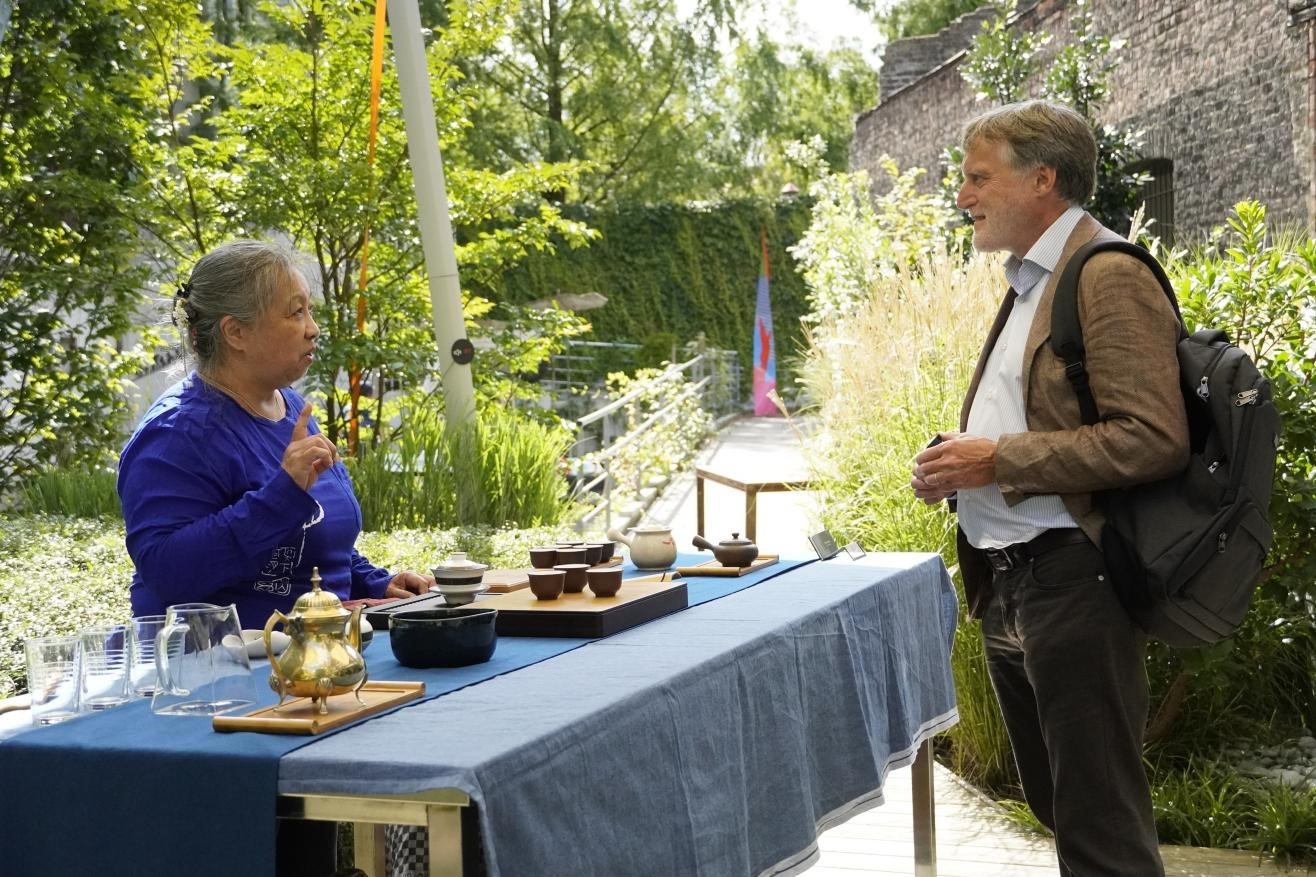 来宾在博物馆的户外花园品味中国茶艺。比利时维他命文化传媒供图