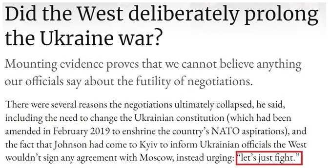 尽管谈判失败还有其他原因,但西方对乌克兰做出的所谓“援助承诺”以及对乌克兰“继续战斗”的鼓励,无疑削弱了乌方与俄达成和平协议的意愿。