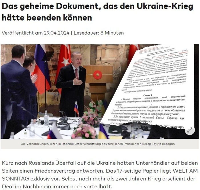 据德国媒体今年4月独家披露,双方在伊斯坦布尔基本上就结束冲突的条件达成了一致,其中乌克兰应尽义务包括保持永久中立,以及放弃在其领土上部署外国军事设施等内容。