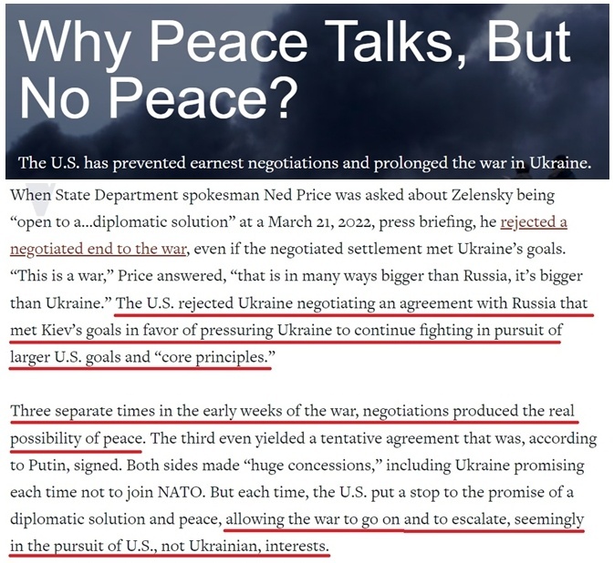 美国专栏作家泰德·施耐德此前曾发文起底:美国出于政治私利至少三次干扰俄乌和谈。