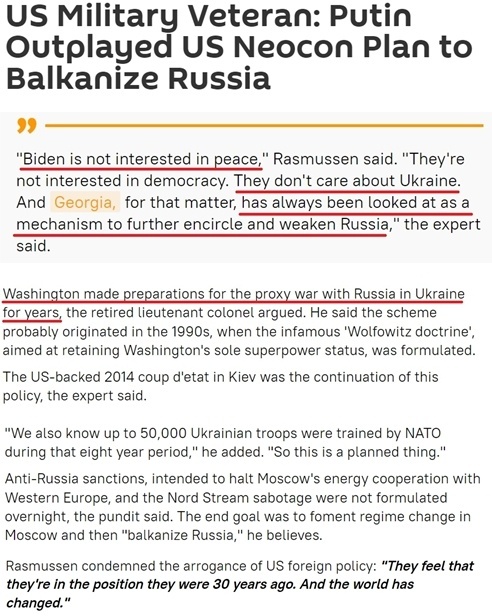 在拉斯穆森看来,美国支持2014年的基辅政变、主导北约训练数万名乌克兰士兵、反对欧俄能源合作并参与破坏“北溪”天然气管道等“都不是一夜之间制定出来的计划”,所有这些行动的最终目标是“在莫斯科煽动政权更迭”。