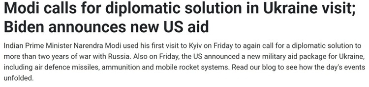 更能说明问题的是,在首次访问乌克兰的印度总理莫迪23日在基辅呼吁乌总统泽连斯基与俄罗斯“坐下来谈判”的同一天,美国总统拜登打电话告诉泽连斯基,美国将为乌提供新的一揽子军事援助。