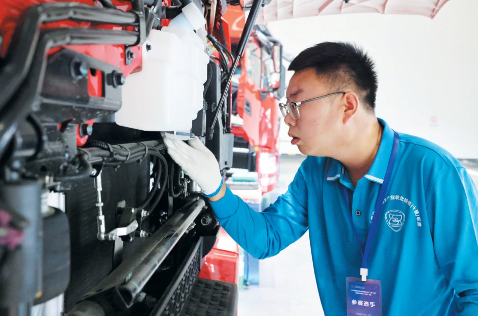 参赛选手现场比拼汽车故障排查检修等技术。记者刘旻摄