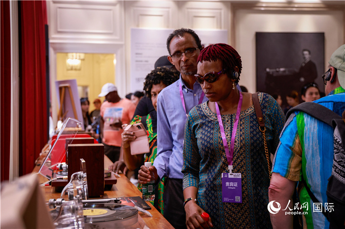 2024“一带一路”媒体合作论坛联合采访调研行成员在东郊记忆黑胶会客厅参观黑胶文化展。人民网记者 伊霄摄