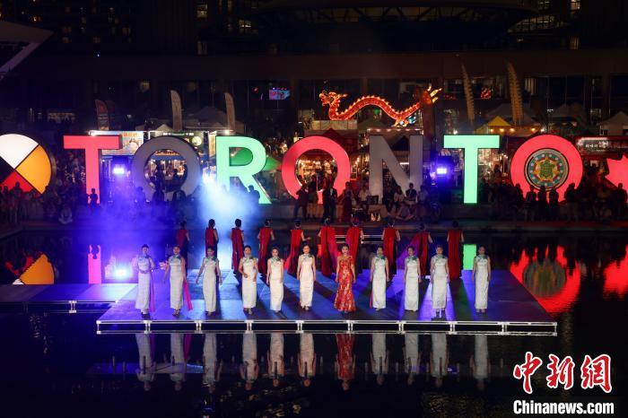 当地时间8月30日,加拿大多伦多,华人文艺团体演员在当日揭幕的第五届多伦多龙文化节水上秀台进行旗袍秀的夜场表演。中新社记者 余瑞冬 摄