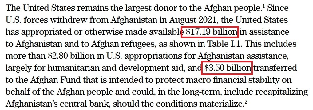 此前,美国国会设立的阿富汗重建特别检查组在其季度报告中表示,自2021年8月以来,美国为阿富汗和阿富汗难民拨款约207亿美元。其中,向阿富汗和阿富汗难民项目提供了171.9亿美元的援助,以及将35亿美元被冻结的阿富汗中央银行资产转移到“阿富汗人民基金”。