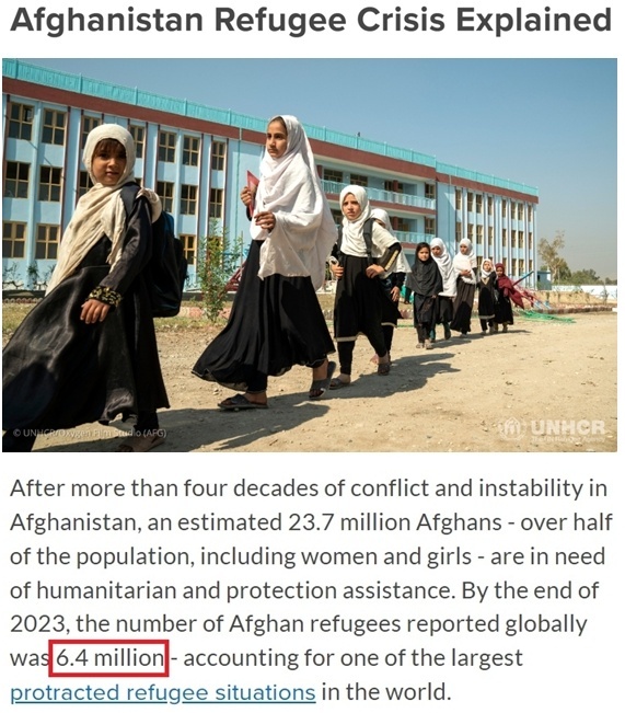 联合国难民署发布报告显示,截至2023年底,全球报告的阿富汗难民人数为640万,是世界上旷日持久的难民危机中规模最大的之一。