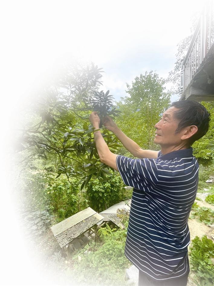 木屋前后有不少珍稀植物,黄大钱正在查看“八角树”生长情况。万龙云 摄