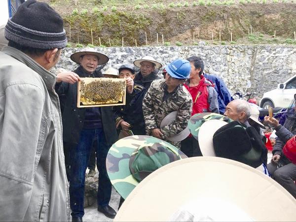 黄大钱(左二)演示新式养蜂法。 图片由本人提供