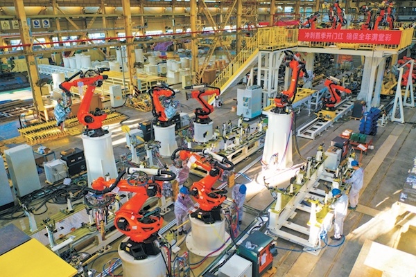 在东风设备制造有限公司生产车间,工人正对焊接设备进行调试。